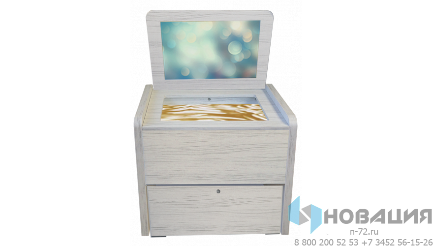 1. Интерактивная световая песочница. Со встроенным зеркалом из акрила и ящиком для инструментов. Защитная крышка служит столешницей. Цвет и интенсивность подсветки меняется. В комплекте кварцевый песок для игр и рисования, гребешки, метелка, совок, деревянные фигурки.