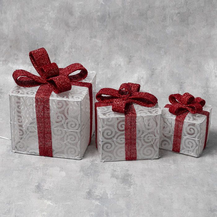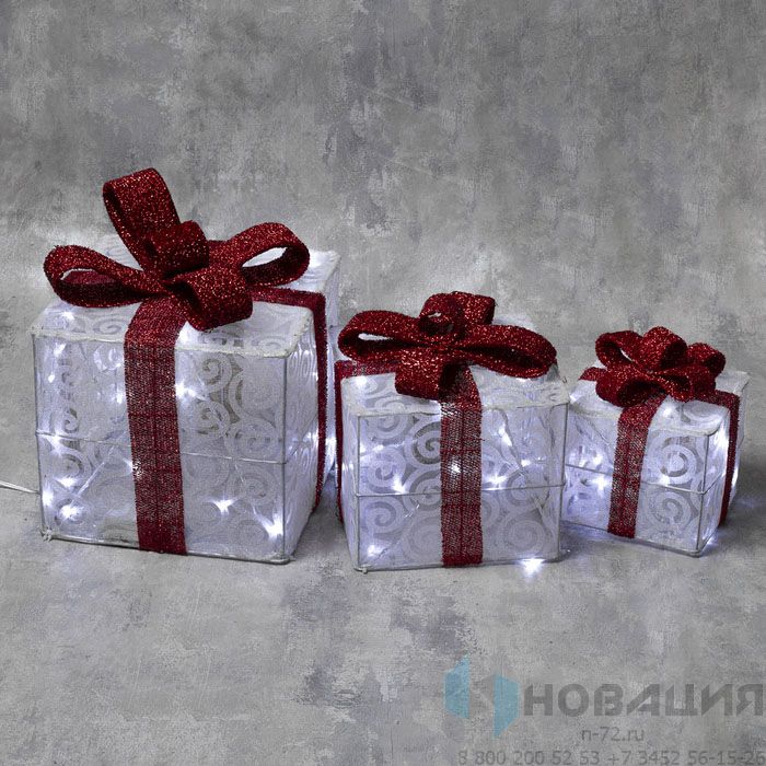 Объемные фигуры в виде подарочных коробок с цветными лентами украшают обстановку перед праздниками. Конструкция подсвечивается белым светом.