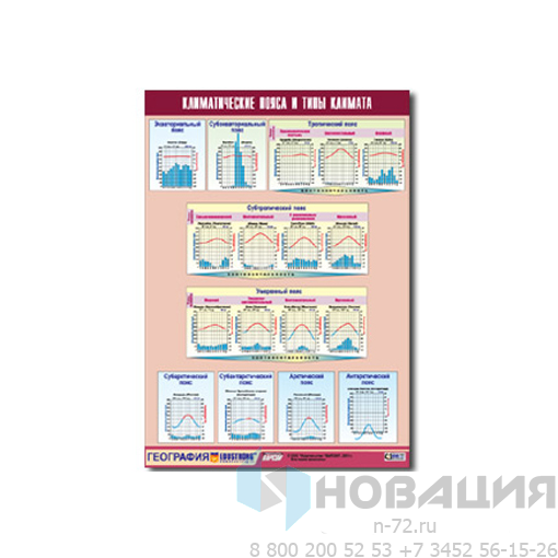 Демонстрационная таблица для кабинета географии оформлена с помощью 1-сторонней полноцветной печати. Плотность листа составляет 440 г/кв.м. На плакате приведены справочные данные о типах климата и климатических поясах, графики, пояснительные надписи.