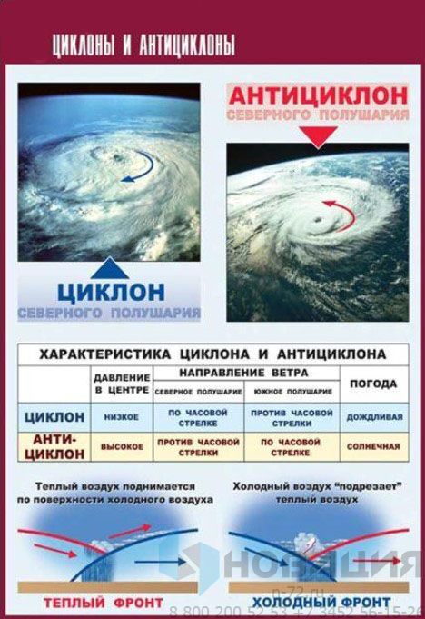 Демонстрационная таблица для кабинета географии оформлена с помощью 1-сторонней полноцветной печати. Плотность листа составляет 440 г/кв.м. На плакате показаны снимки с изображениями циклона и антициклона, приведены характеристики, схематически показаны холодный и теплый фронт.