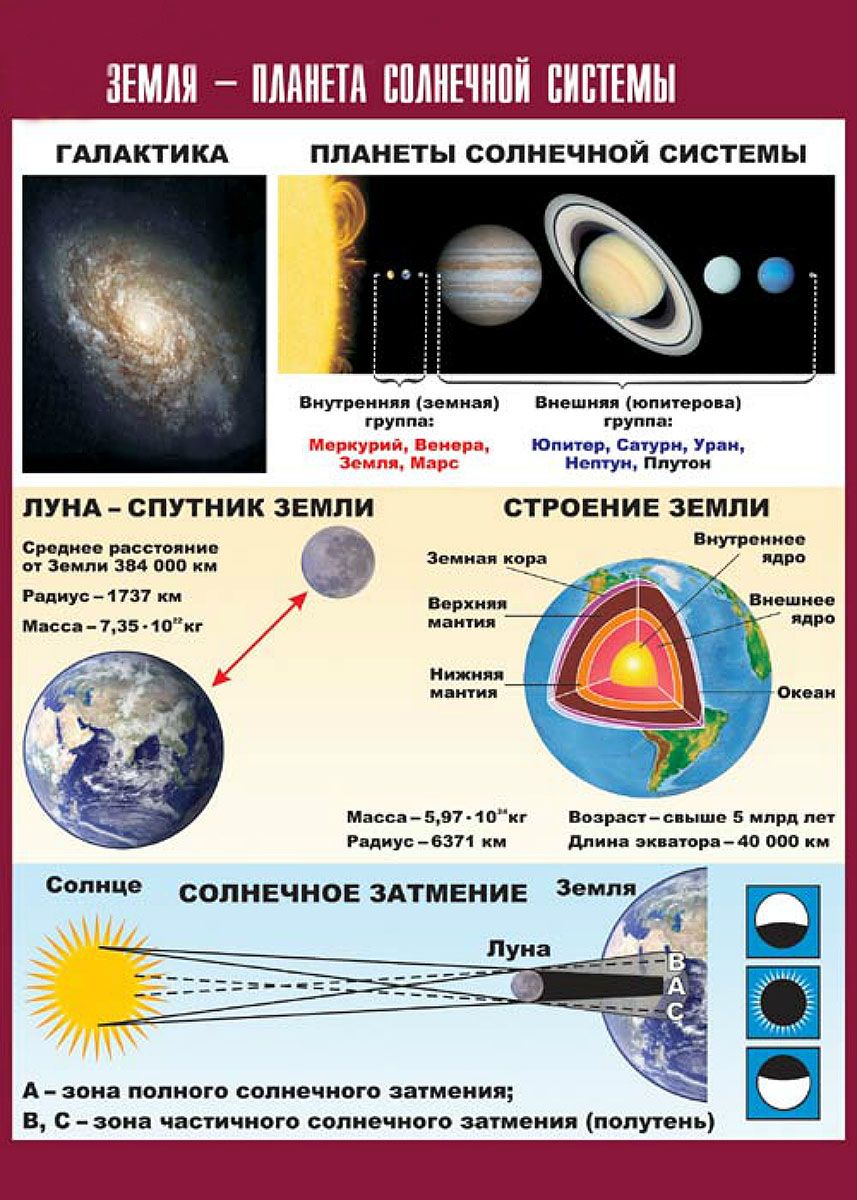 Демонстрационная таблица для кабинета географии оформлена с помощью 1-сторонней полноцветной печати. Плотность листа составляет 440 г/кв.м. На плакате с изображениями фрагмента Галактики, планет Солнечной системы и Луны приведены справочные данные, показано строение Земли, процесс солнечного затмения.