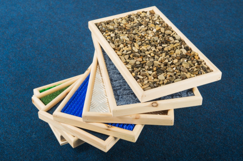 Модули отличаются по степени плотности, шероховатости поверхностей. Дополнительным плюсом является то, что ребенок получает возможность прикоснуться к материалам, имитирующим природные неровности.