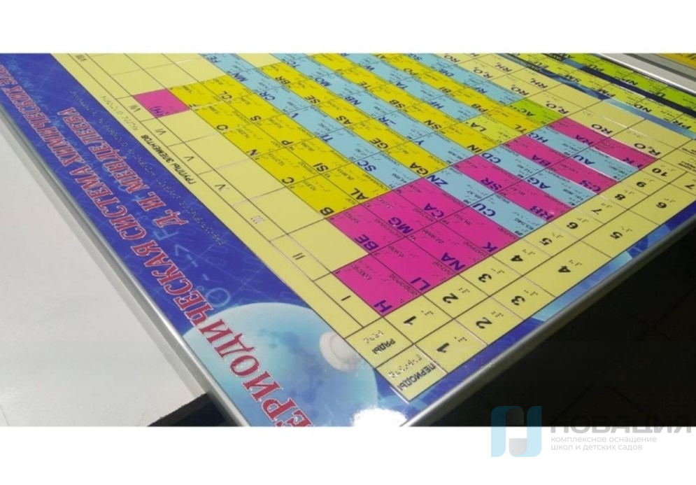 Стенд содержит полную периодическую систему химических элементов. Наглядная и тактильная информация продублирована точечным шрифтом по системе Брайля.