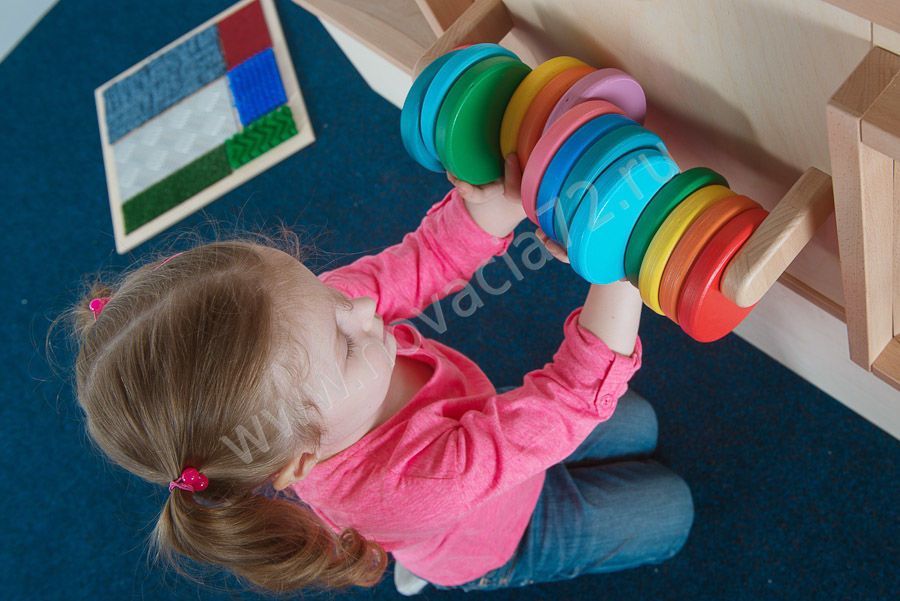 На тактильной панели есть стойка с разноцветными кругами. Способствует развитию мелкой моторики и осязательных навыков. Может использоваться в качестве дидактического материала для изучения цветов.
