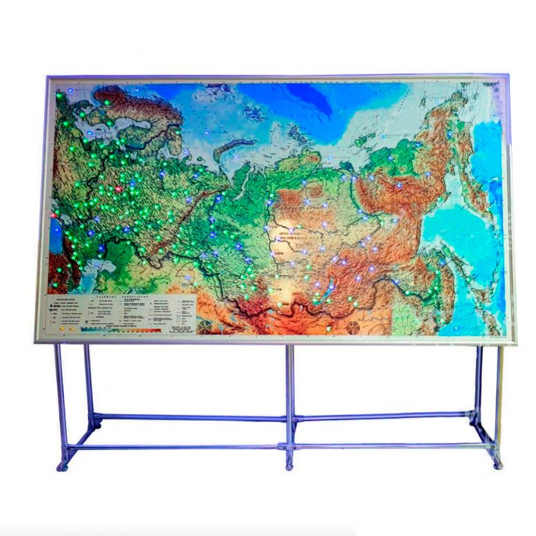 - поверхность карты рельефная и яркая, выделены внешние и внутренние границы России, обозначены точками крупные города и столица,