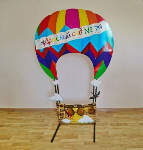 Стенд в виде воздушного шара с отверстием для лица размещается на металлокаркасе с 2-мя опорами. Конструкция предназначена для фотосъемки.
