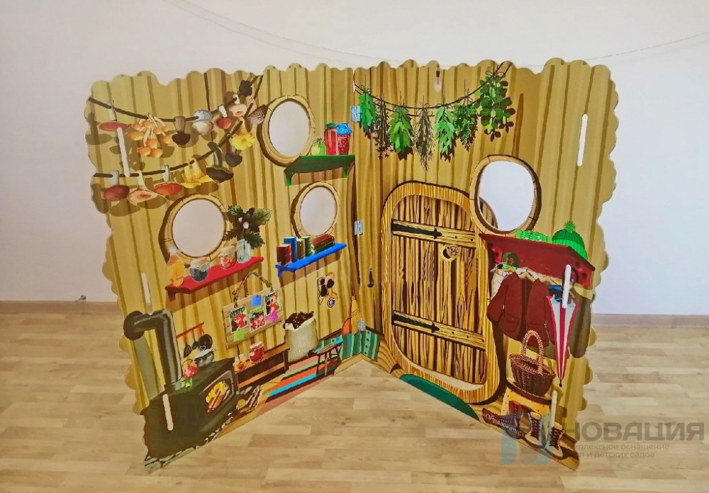 Двусторонняя декорация предназначена для сценических постановок и утренников. На поверхность нанесен цветной рисунок деревьев. В конструкции есть три круглых отверстия и открывающаяся дверца.