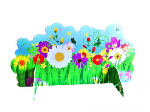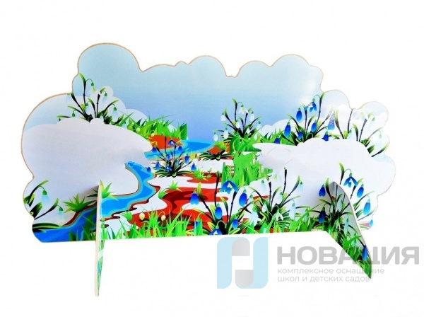 На одной стороне цветной декорации расположено изображение цветочной поляны, на другой - весенней поляны с подснежниками. Подходит для оформления сцены к спектаклям и праздникам.