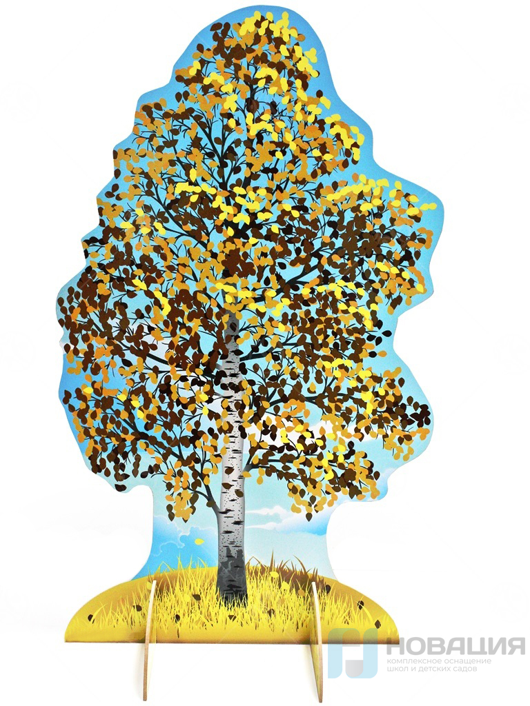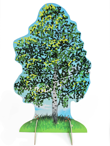 Разноцветная декорация выполнена в виде березы. На одну сторону нанесено изображение летнего варианта, на другую - осеннего.