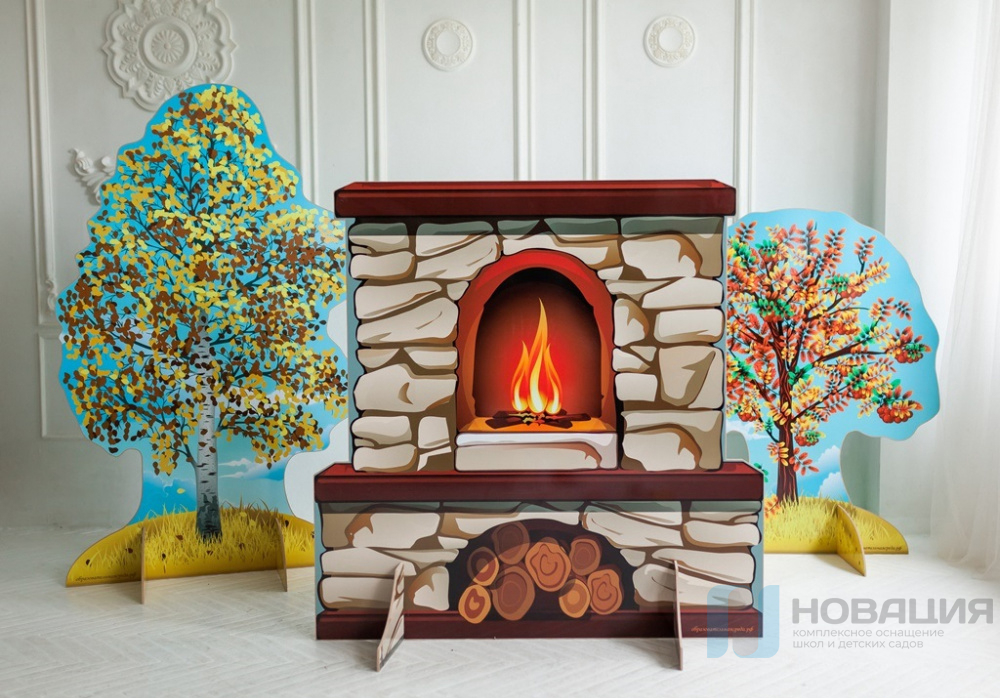 На одну сторону декорации нанесен цветной рисунок камина, на другую - традиционной русской печи. Предназначена для оформления сцены для утренников и сценических представлений.
