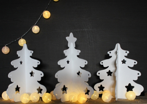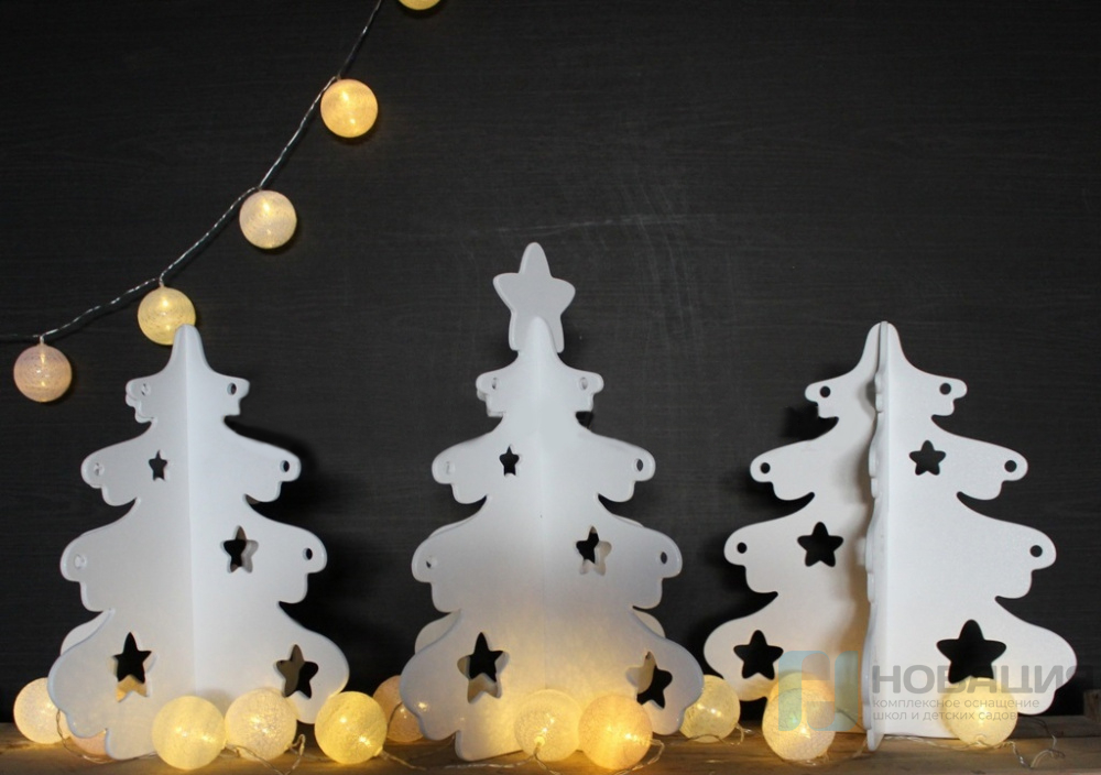 В комплекте 3 разборные декорации. Изготовлены в виде однотонных резных елок с фрезеровкой в виде звезд. Каждая декорация состоит из 2-х частей, которые легко монтируются.