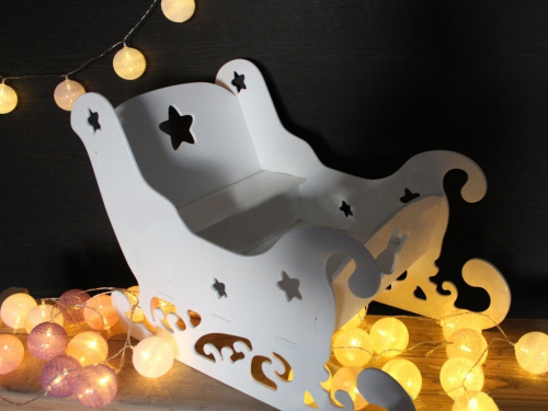 Разборная декорация предназначена для оформления сцены к спектаклям и новогодним праздникам, для хранения подарков на утренниках. Выполнена в виде однотонных саней резной формы. Украшена фрезеровкой в виде завитков и звезд. Легко собирается и разбирается.