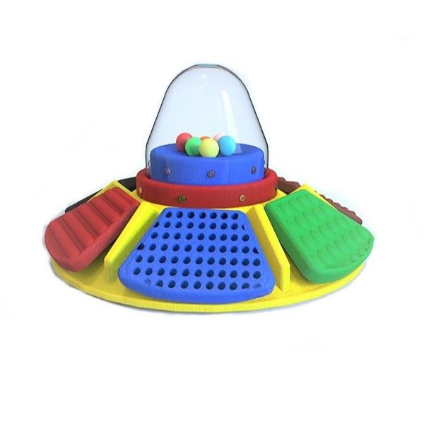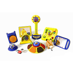 Конструкция получает питание от 6-ти батареек типа АА (приобретаются отдельно). Ребенок нажимает и удерживает разноцветные клавиши. Каждая из 6-ти клавиш реагирует на действие: вибрирует, издает звук, переливается огнями, происходит вращение по кругу. В центральной колбе с треском перемещаются шарики. Ребенок с интересом следит за устройством, приобретая новый опыт восприятия.