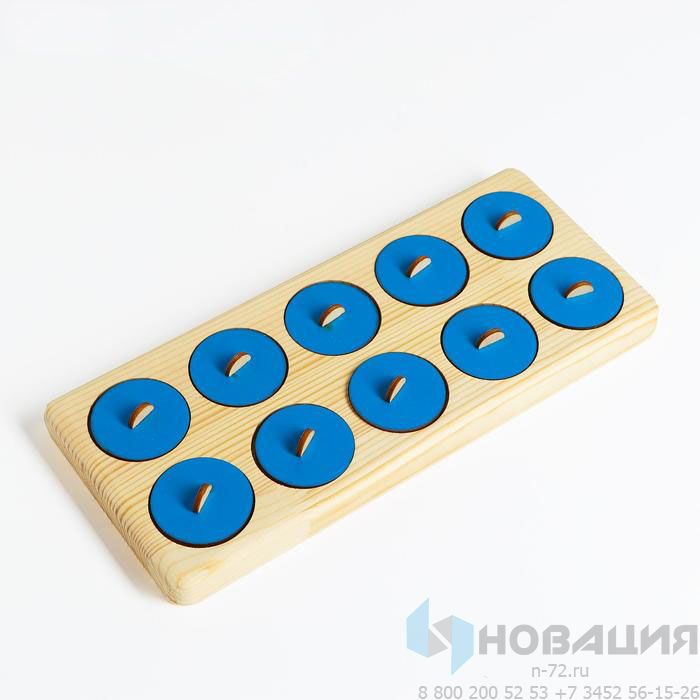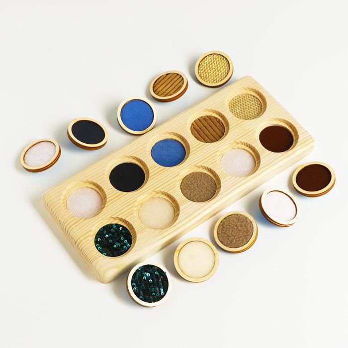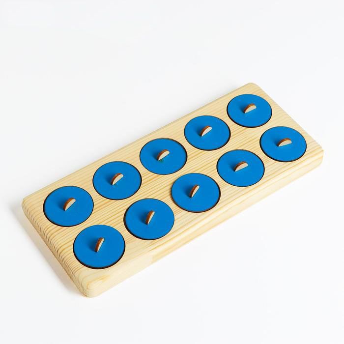 Тактильная головоломка-сортер представлена отшлифованной деревянной основой с отверстиями и круглыми элементами. Кружки различаются фактурой верхних поверхностей. Варианты игр на развитие мелкой моторики, навыков счета и цветоразличения описаны в инструкции.