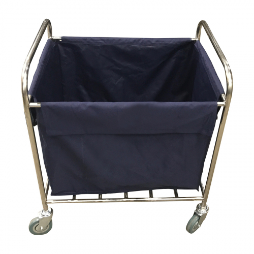 Тележка с дугообразными ручками стоит на 4-х колесах, d 75 мм. Дно решетчатое. Оснащена водонепроницаемым мешком из ткани.