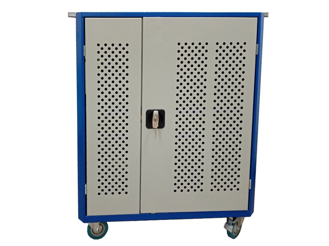 В тележке с перегородками компактно хранятся и заряжаются ноутбуки. Конструкция оснащена 31 розеткой (220-230 В). Потребляемая мощность 1,3 кВт/ч.