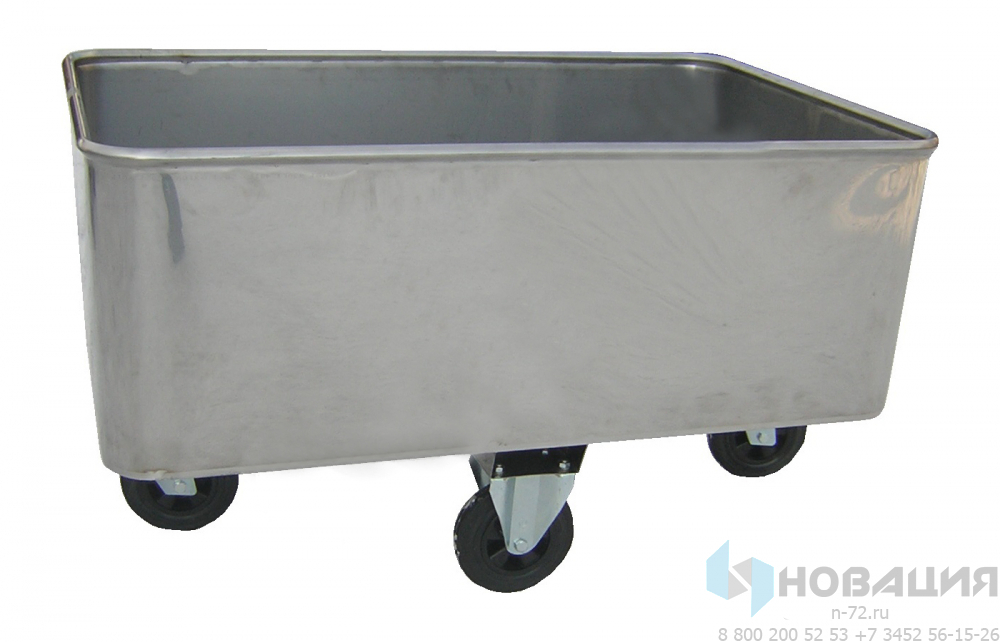 Тележка для белья выдерживает 80 кг. Объем короба из сплошного стального листа 500 л. Окантовка в виде трубы заменяет ручки на коробе. Корпус установлен на колеса (d 200 мм).