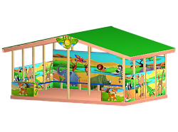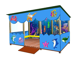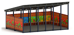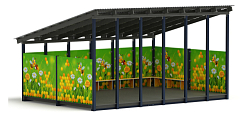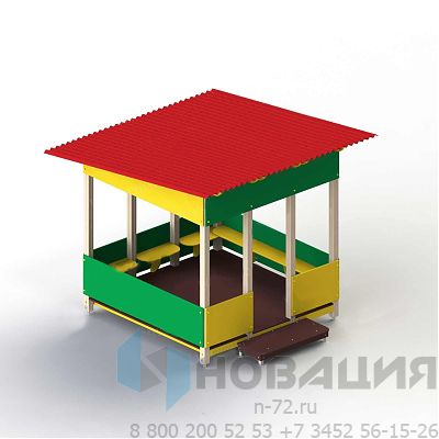 Теневой навес для отдыха оснащен одним входом. Порог и пол покрыты противоскользящей фанерой. Вдоль 4-х стен с панелями и опорными столбами закрепляются скамейки. Рельефный скат, установленный под наклоном, защищает конструкцию от солнца и осадков.