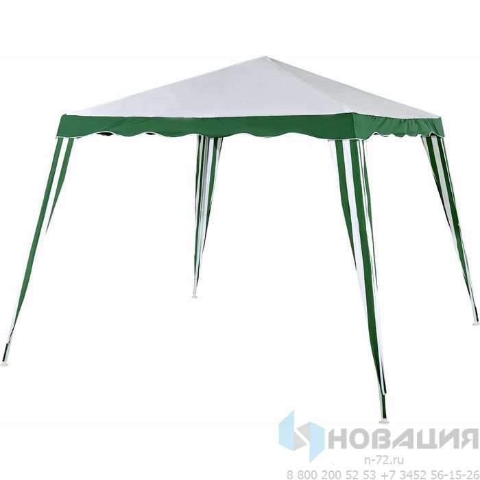 Палатка из зеленого и белого полиэстера плотностью 120 г/м2 и 160 г/м2 закрепляется на земле в 4-х точках, купольный навес защищает детей от дождя и прямых солнечных лучей.