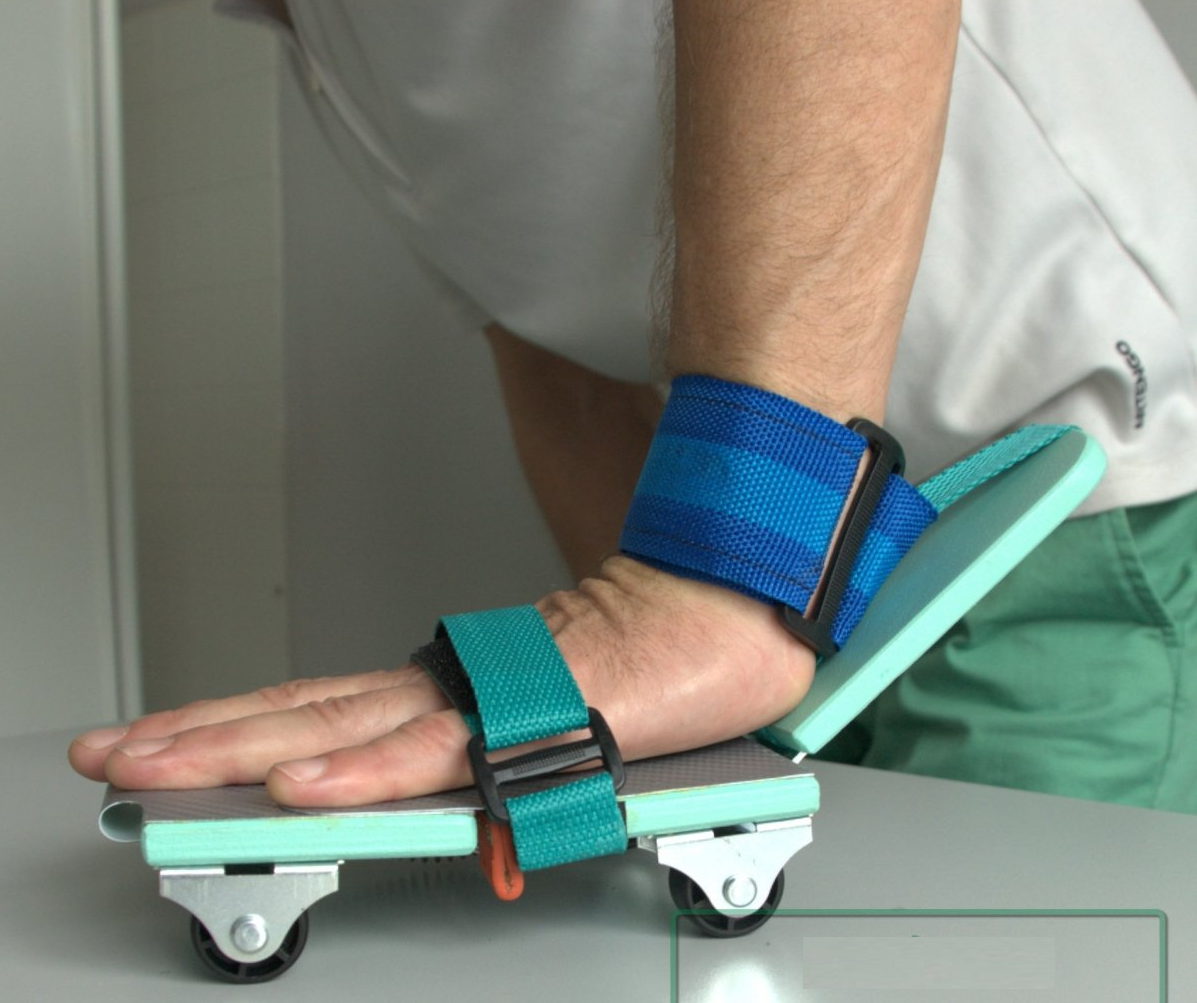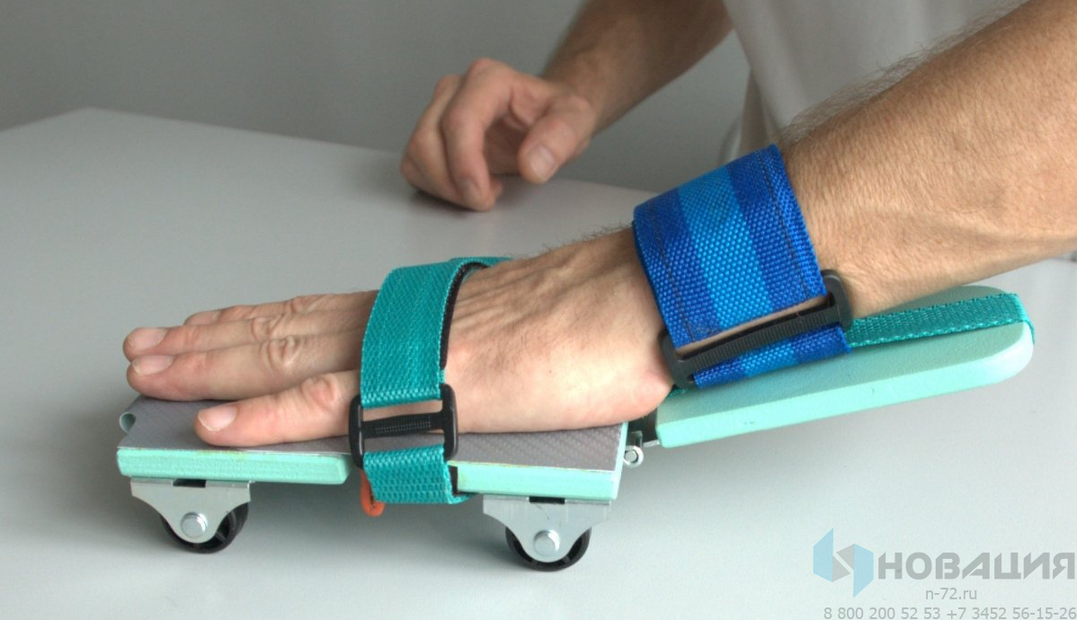 Ладонь и запястье закрепляются на рабочей поверхности резинками на липучках. Ребенок перемещает тележку по ровной горизонтальной поверхности одной или 2-мя руками.