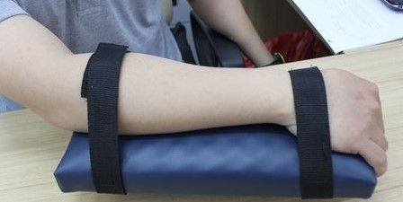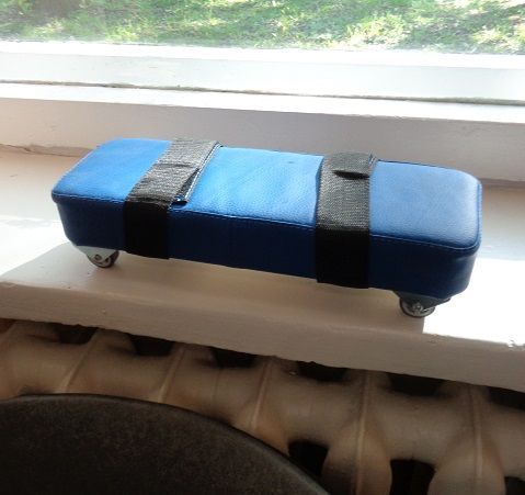 Фанерное основание с мягким покрытием устанавливается на колеса без фиксаторов. Предплечье закрепляется резинками на липучках. Ребенок перемещает тележку по ровной горизонтальной поверхности.