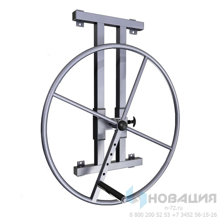 Конструкция крепится к полу или стене. Металлическое колесо дополняется ручкой, которая выдвигается, определяя диаметр вращения. Дошкольники берутся за эргономичную рукоятку и приводят в действие движущийся элемент.