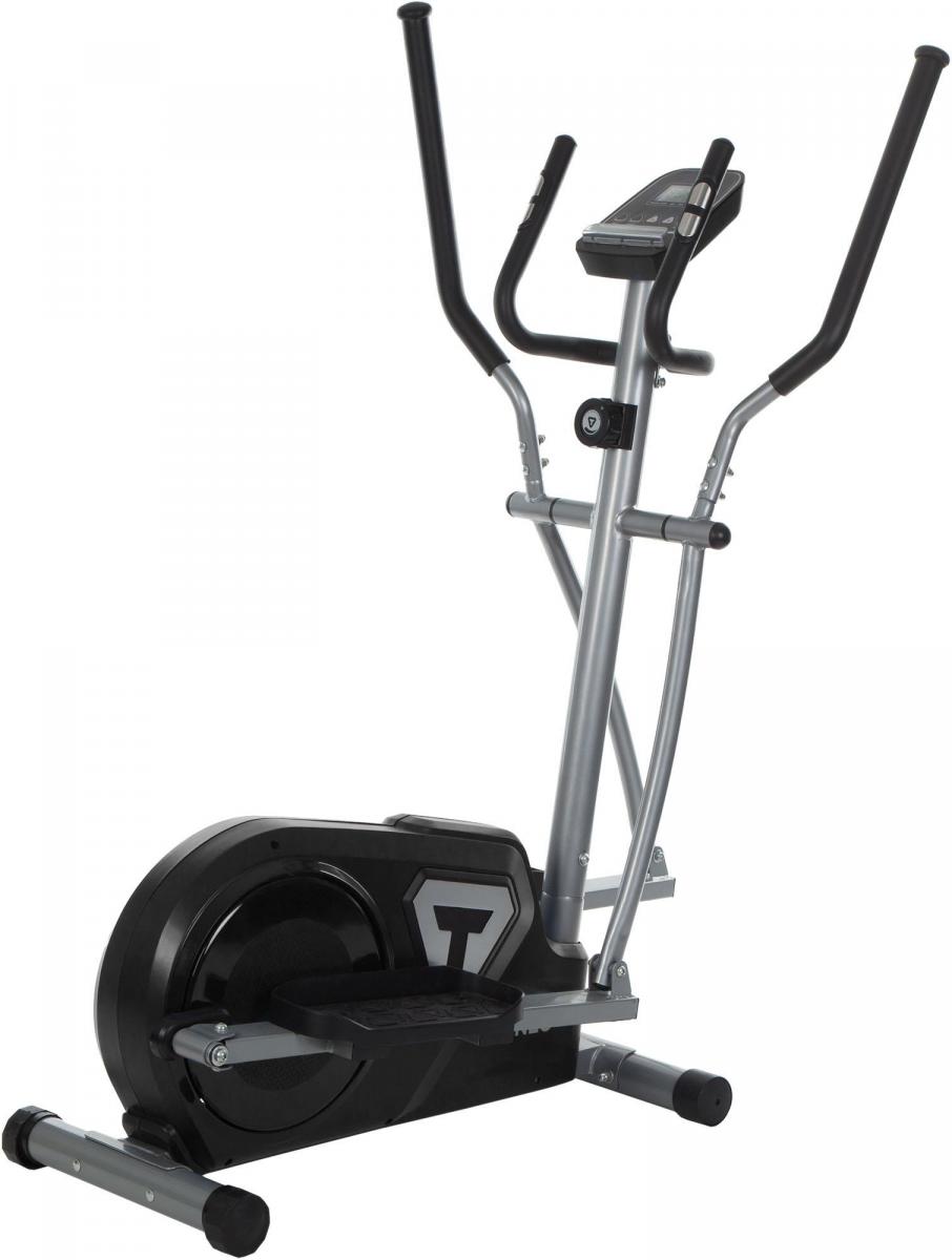 Тренажер для кардиотренировок оснащен датчиками на поручнях и LCD-дисплеем. Длина шага составляет 390 мм. Нагрузка регулируется механически. С помощью эллиптического тренажера прорабатываются мышцы рук, плеч, шеи, спины, пресса, ног, ягодиц.