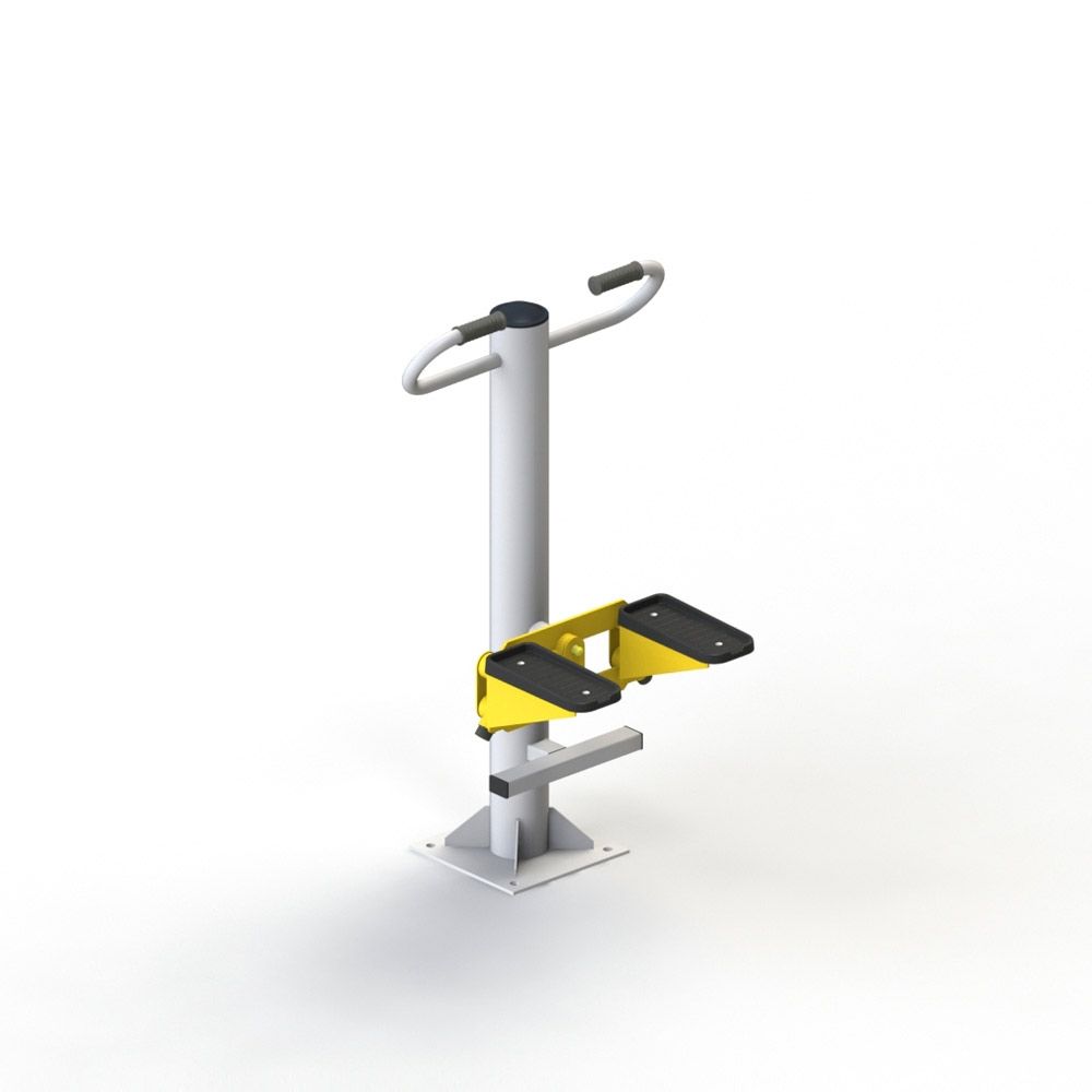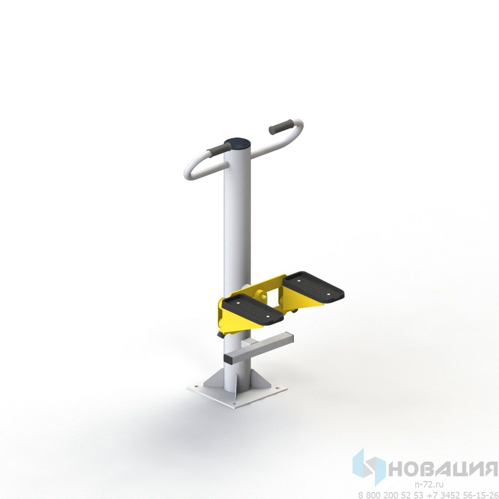 Стойка из круглой трубы на опорной плите оснащается пластиковой заглушкой. Рукоятки частично прорезинены, устойчивы к низким температурам. Степ-платформа выполнена из морозостойкого пластика. Занятия на платформе имитируют подъем по ступеням.