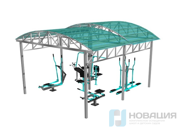 - 5 тренажеров, размеры (ШхГхВ) - 5300х4600х3200 мм, состав: теневой навес с двумя секциями, уличные тренажеры Гребля, Жим и Подтягивание, Лыжники, Эллиптический тренажер, Гиперэкстензия и пресс;