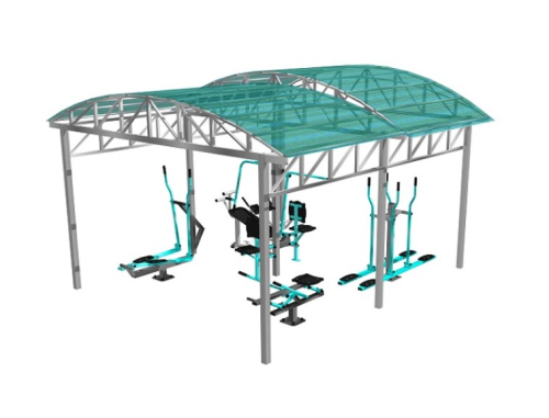 - 10 тренажеров, размеры (ШхГхВ) - 7200х4600х3200 мм, состав: теневой навес с тремя секциями, уличные тренажеры Лыжники, Гиперэкстензия, Эллиптический тренажер, Гребля, Жим ногами с нагрузкой, Диск, Шпагат, Жим к груди, Жим от груди, Вертикальная тяга;