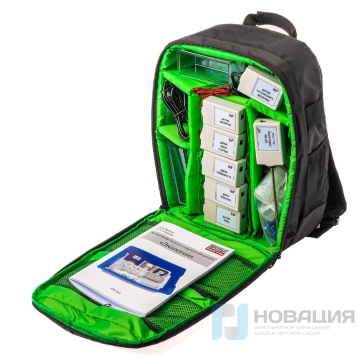 Все комплектующие укладываются в рюкзак с мягкими отсеками: набор должен быть защищен от ударных и силовых нагрузок. С помощью инструментов и приборов школьник фиксирует параметры воздушной и водной сред. На занятии проводится экологический мониторинг атмосферы, водной среды, осадков, почвы и боты.
