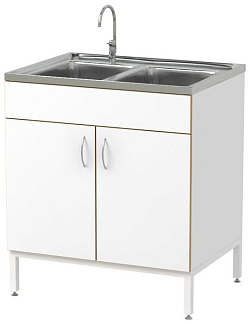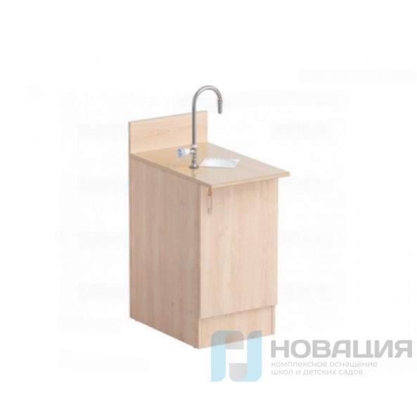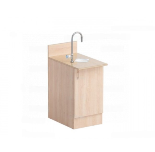 Тумба изготовлена из ЛДСП. Столешница облицована химически стойким пластиком. Видимые торцы обрамлены ПВХ-кромкой. Тумба оснащена водоразборной колонкой и сливной раковиной.