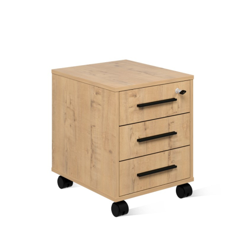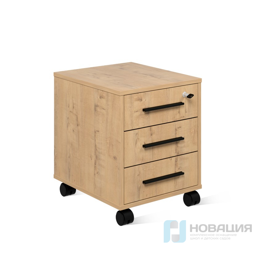 Тумба размещается на четырех пластиковых колесных опорах, которые позволяют легко перемещать изделие. Состоит трех выдвижных ящиков высотой 130 мм, верхний из которых закрывается на ключ.