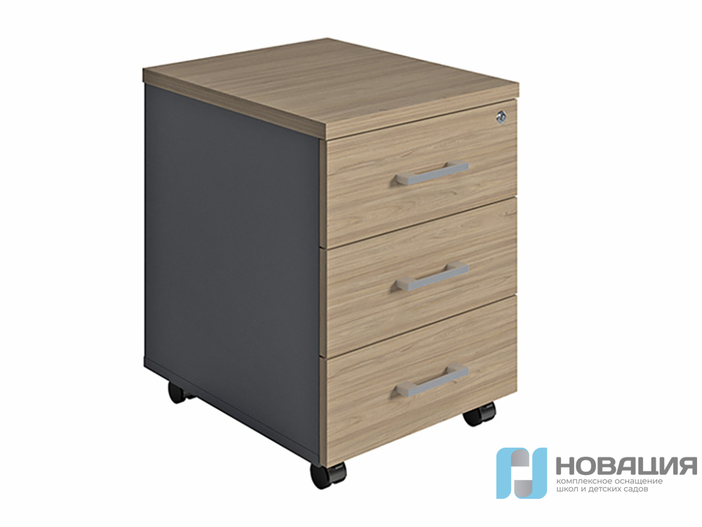 Ящики с эргономичными металлическими ручками и шариковыми направляющими полного выдвижения. Тумба оборудована центральным замком и имеет верхний ящик с пластмассовым лотком для хранения канцелярии.