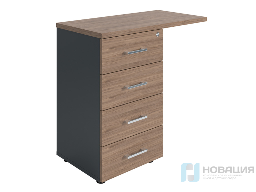 Конструкция оснащена удобными металлическими ручками, ящиками с полным выдвижением на шариковых направляющих и центральным замком. Верхний ящик дополнен пластиковым лотком для канцелярии.