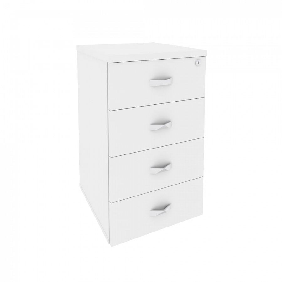 Приставная тумба для кабинета оснащается 4-мя выдвижными ящиками с ручками. Верхний ящик запирается на ключ. Прямоугольный топ выполняет функцию дополнительной полки. Опоры с пластиковыми элементами и винтами регулируются по высоте. Топ и фасады ящиков из ЛДСП отделаны кромками толщиной 0,4 мм и 2 мм.