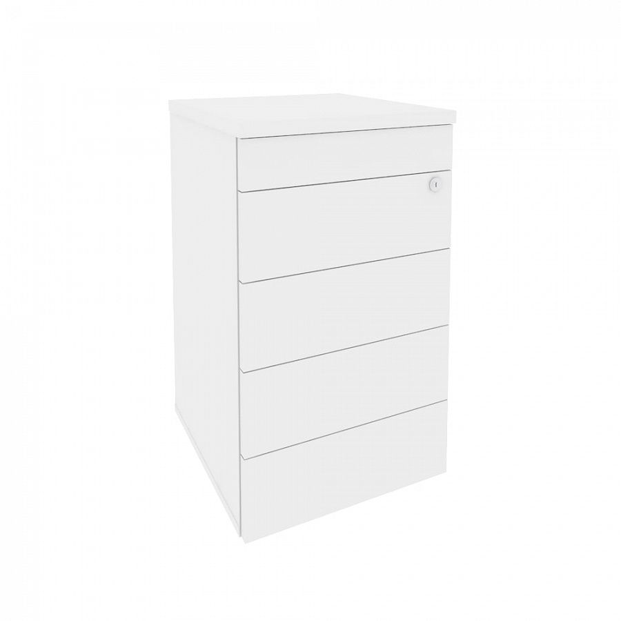 Тумба приставная для офиса оборудуется 5-ю выдвижными ящиками с нажимным выталкивающим механизмом (без ручек). Верхний ящик запирается на ключ, над ним закрепляется декоративная планка. Прямоугольный топ выполняет функцию дополнительной полки. Опоры с пластиковыми элементами и винтами регулируются по высоте. Топ и фасады ящиков из ЛДСП отделаны кромками толщиной 0,4 мм и 2 мм.
