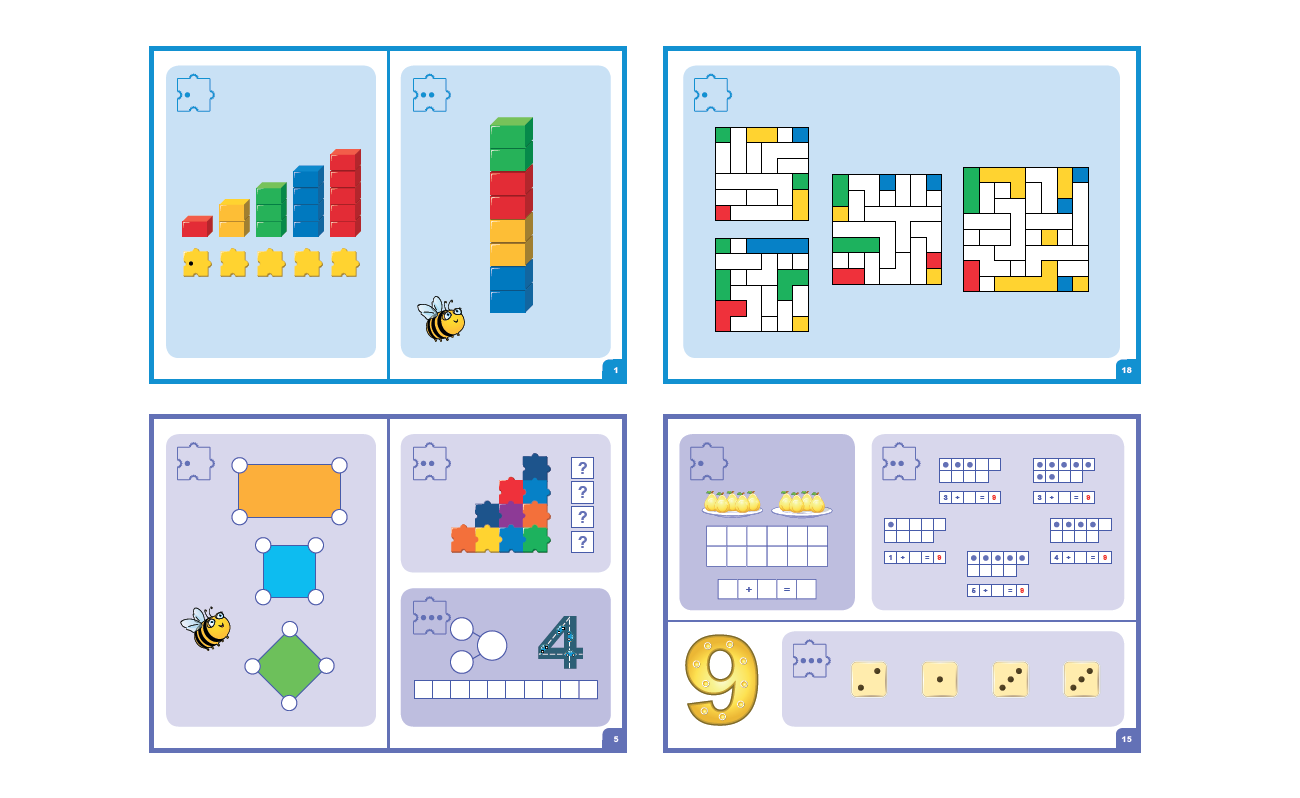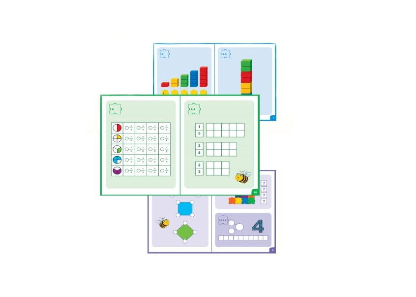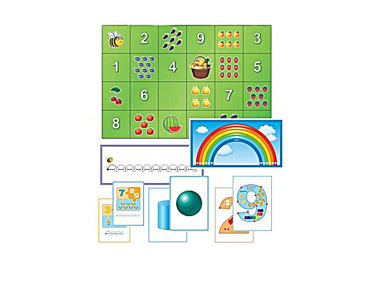 Карточки с яркими картинками распечатаны на отдельных листах, задействуются в нескольких вариантах игр. Комплекс нацелен на поэтапное освоение математики, через визуальные ассоциации, с плавным усложнением заданий.