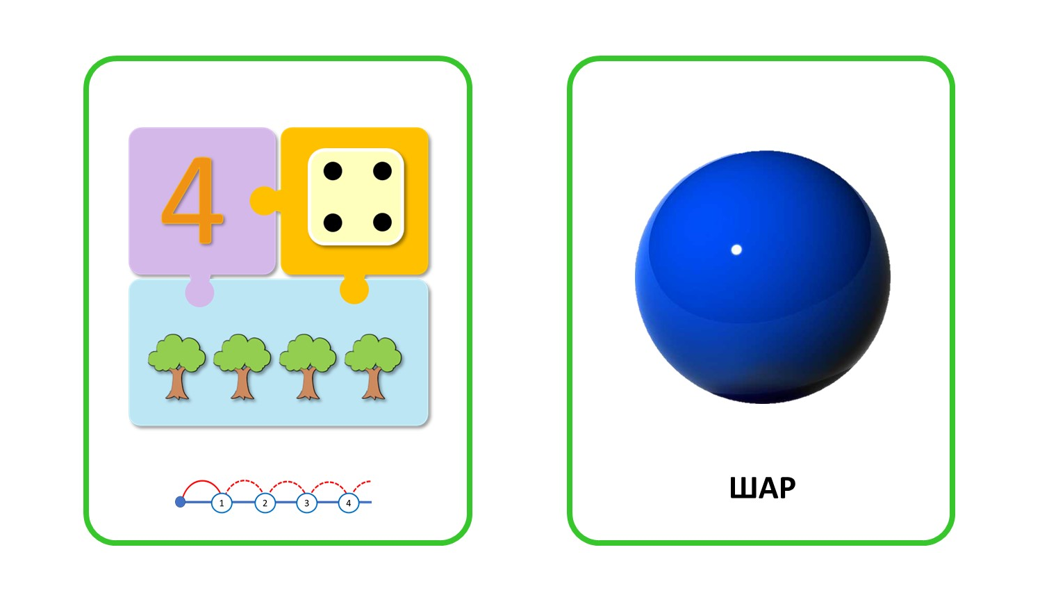- 2 набора карточек для демонстрации (формат А5, темы: цифры-пазлы, геометрические фигуры);