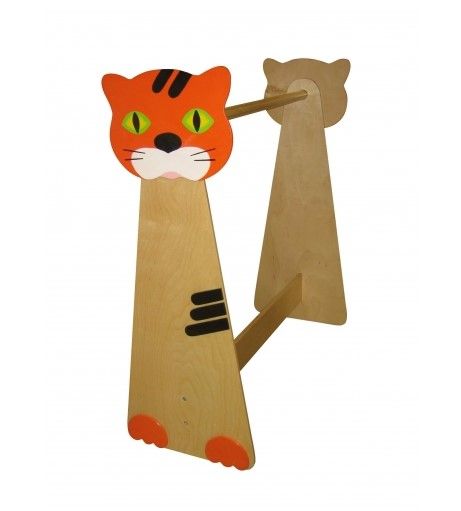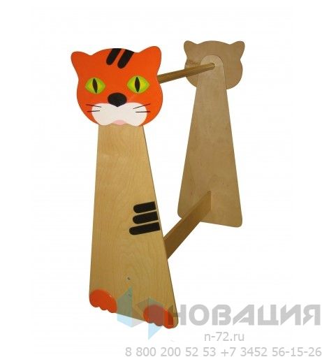 Уголок ряжения размещается в детском театре. Штанга для вешалок закреплена между 2-мя фигурными панелями. На внешних сторонах стенок изображен кот. Элементы соединяются нижней перекладиной.