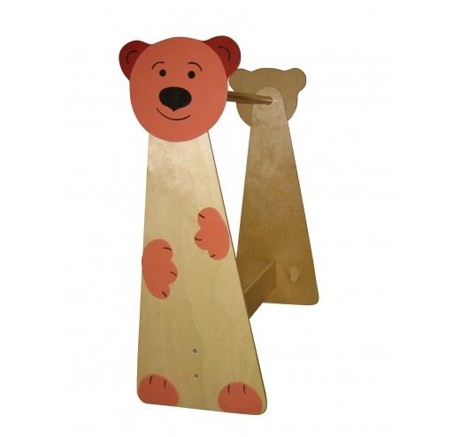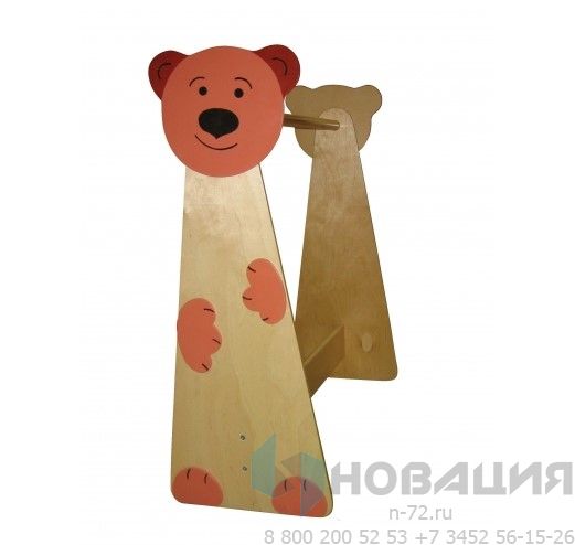 Детский уголок ряжения размещается в гримерной. 2 фигурные панели украшены изображением медведя. Между ними закреплена штанга для вешалок с костюмами. Стенки соединяются нижней перекладиной.