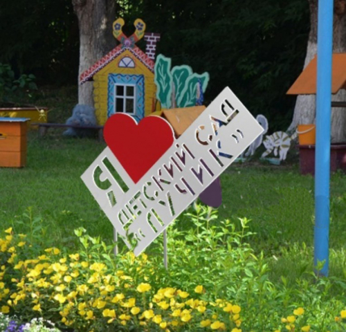 Полноцветная фигура с изображением сердца и надписью “Я люблю детский сад” размещается на металлических стойках (входят в комплект). Содержание надписи согласовывается с заказчиком.