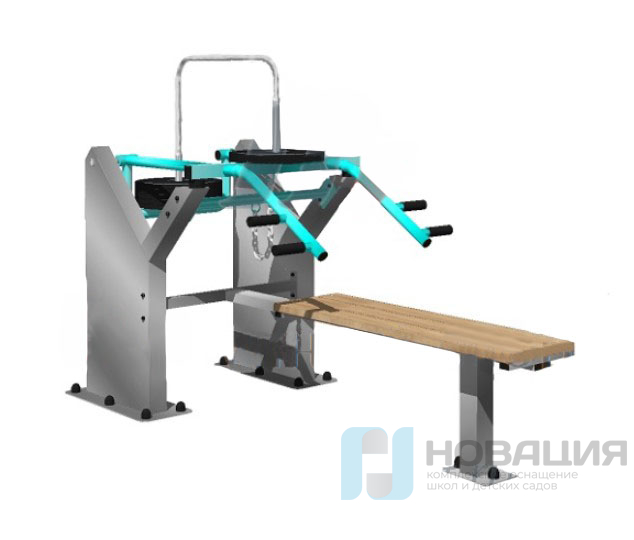 Тренажер для укрепления мышц груди, спины и рук размещается в зоне воркаута. Упражнения аналогичны жиму штанги. Нагрузка переменная, шаг 10 кг. Жим выполняется в положении лежа. Установка подходит для детей ростом от 140 см. Предусмотрено 2 уровня хвата.