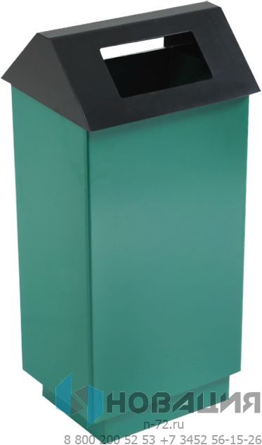 Урна выполнена в форме домика. Изделие состоит из прямоугольного корпуса и крышки с 2-мя отверстиями на скатах. Стационарный ящик предназначен для  бытового мусора.