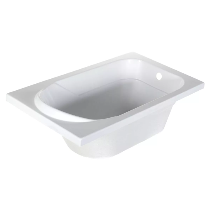 Пристенная ванна с противоскользящим покрытием используется для купания детей из ясельной группы. Изделие поставляется в белом цвете, без ножек. Сантехника окружена бортиками. Сторона, противоположная стене, имеет вытянутую овальную форму. Диаметр сливного отверстия составляет 52 мм.