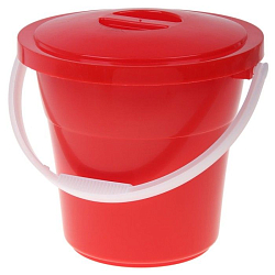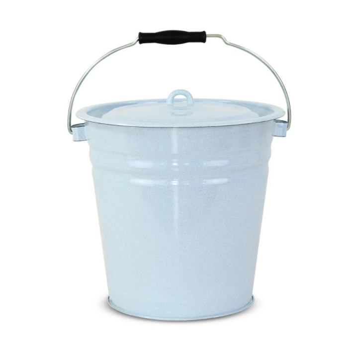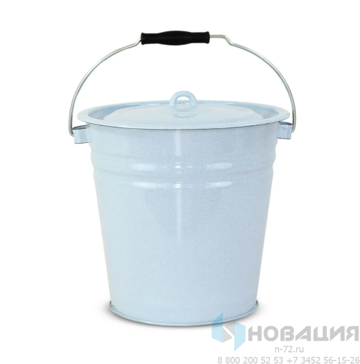 Ведро с крышкой и ручкой подходит для столовой. Внутри хранятся и переносятся пищевые продукты. Корпус цилиндрический, без рисунка, покрыт эмалью. Металлическая ручка дополняется накладкой-держателем.