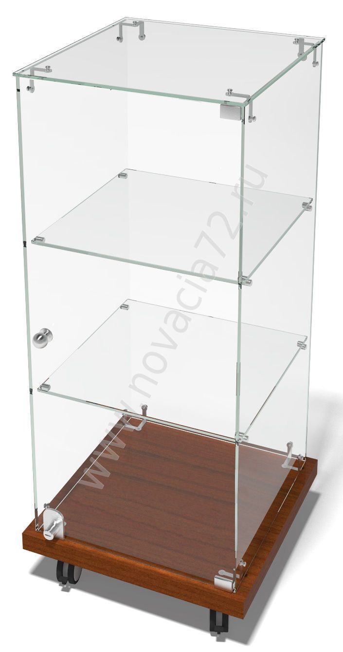 Витрина с квадратными основанием из ЛДСП оснащена дверцей с замком и 2-мя полками из стекла марки М1.