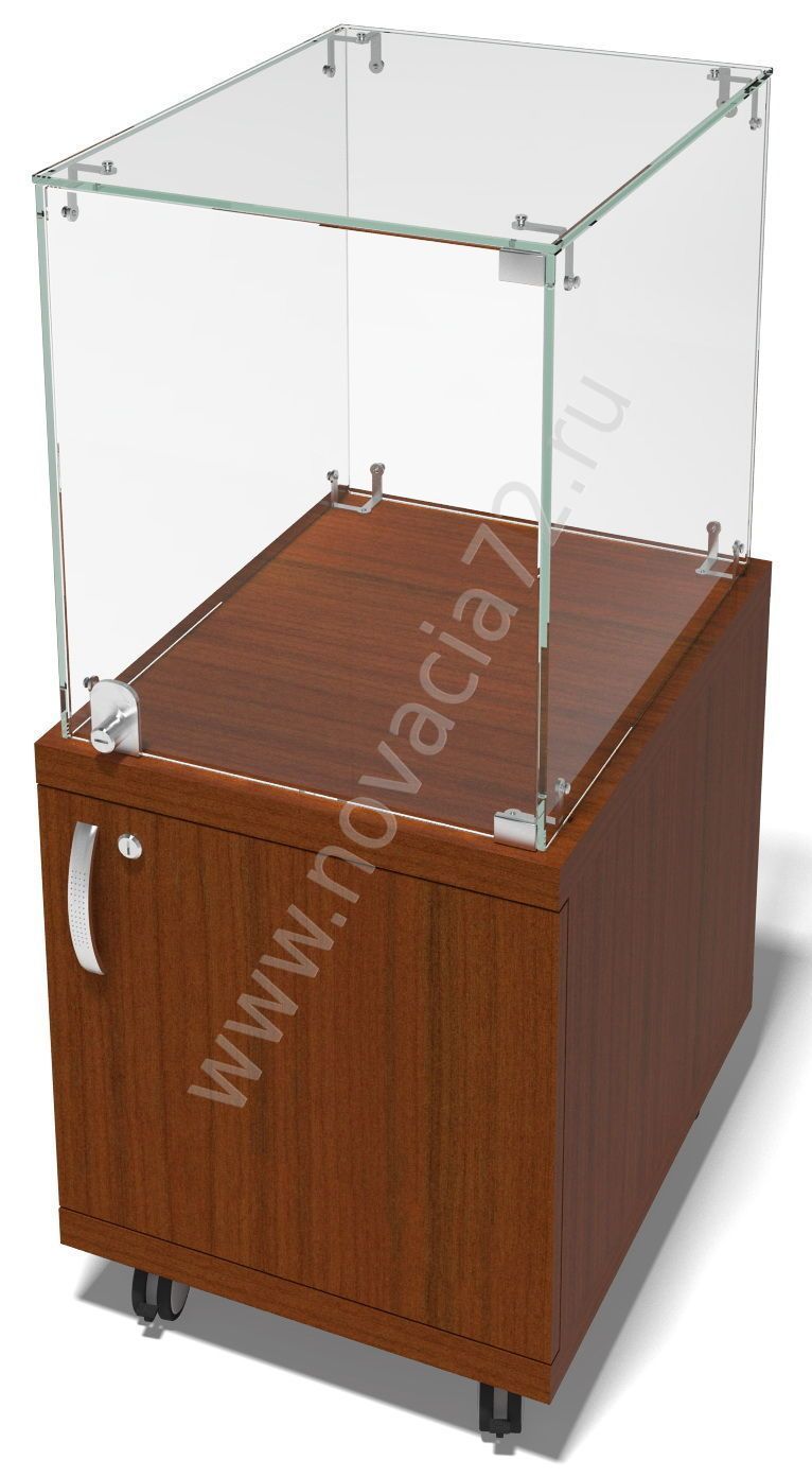 Витрина оснащена кубическим отсеком из стекла марки М1 и тумбой для хранения из ЛДСП. Обе части дополнены одностворчатыми дверками с замками.