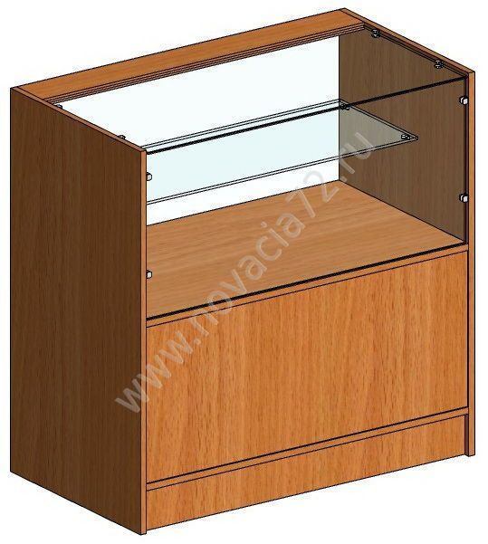 Нижняя часть служит для хранения предметов. Отделение без задней стенки скрыто за глухим фасадом. Выше расположен отсек с 1 полкой для выставок. В нем можно размещать образцы пособий, поделки, медали. Фасад и полка, глубиной 300 мм, стеклянные. Максимальная распределенная нагрузка на полку 7 кг.