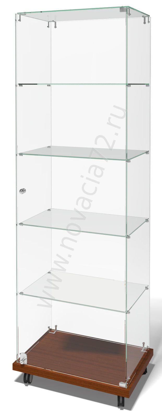 В мебели для хранения и выставок 4 полки, дверца с замком, крышка и боковые стенки из стекла марки М1. Пенал стоит на прямоугольном основании из ЛДСП.